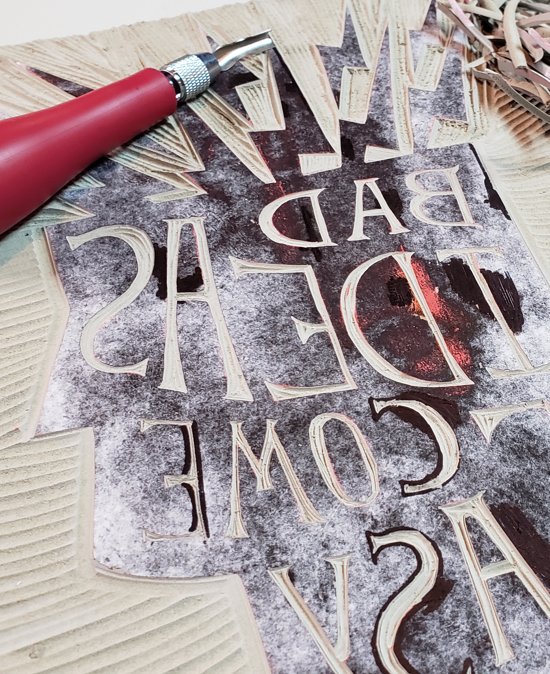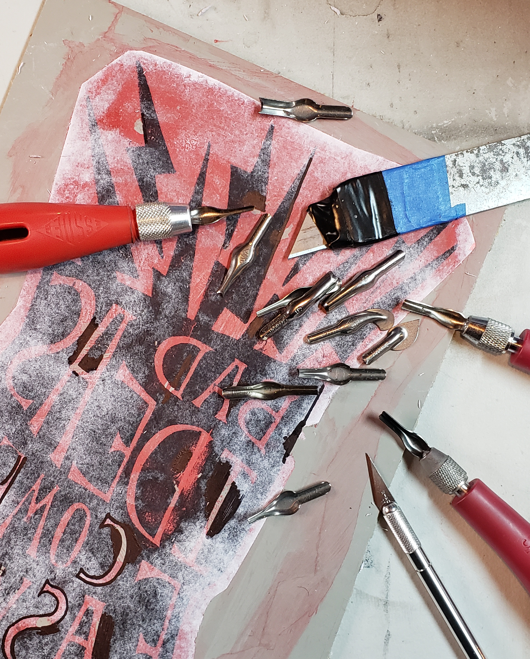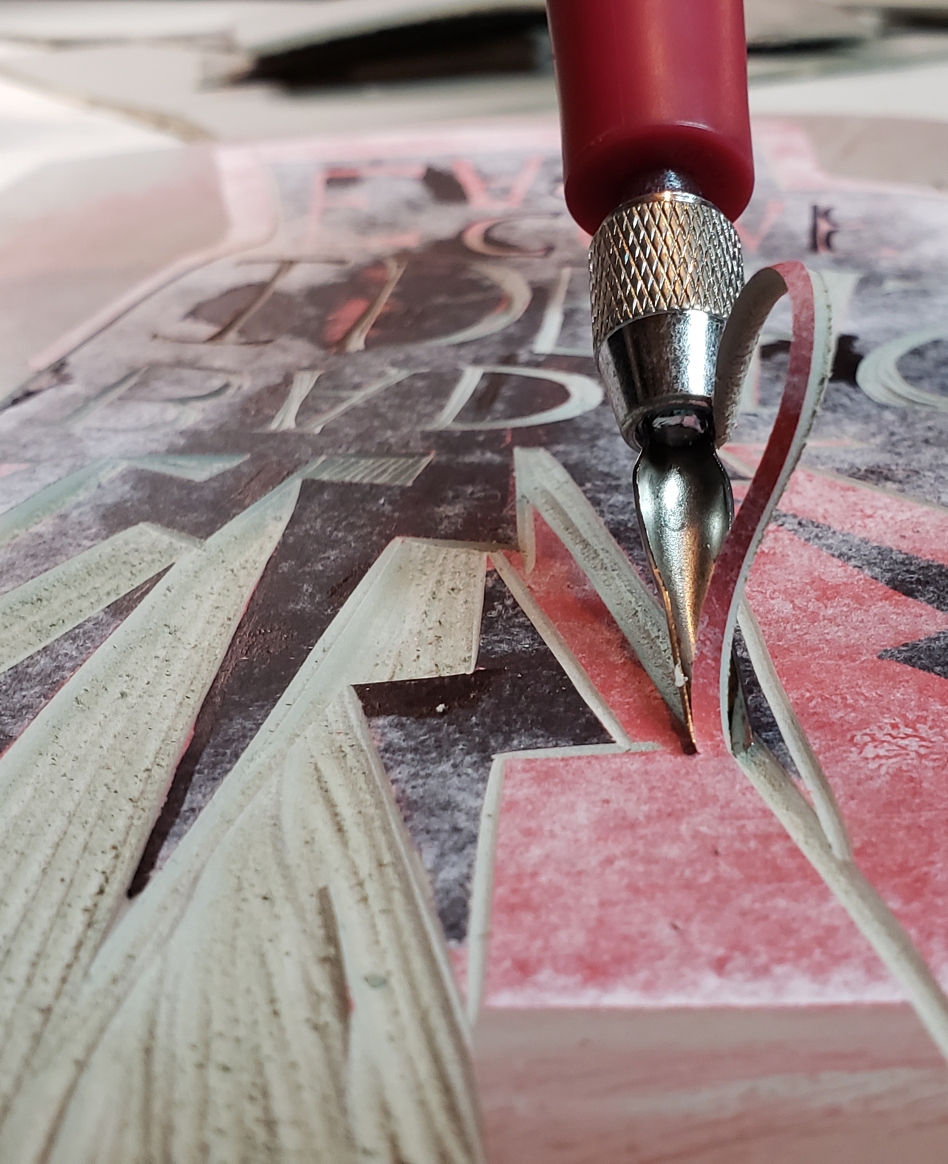 I used linocut, one of my absolute favorite mediums to design an image and give my project an aesthetic that would unify the poster series. Linocut invokes utility by being a really bare-bones design and implementation process. You develop efficiencies in this medium over time, and the end product is a print, the most democratic artistic medium that allows the artist to be an independent contributor of ideas to the design dialog.